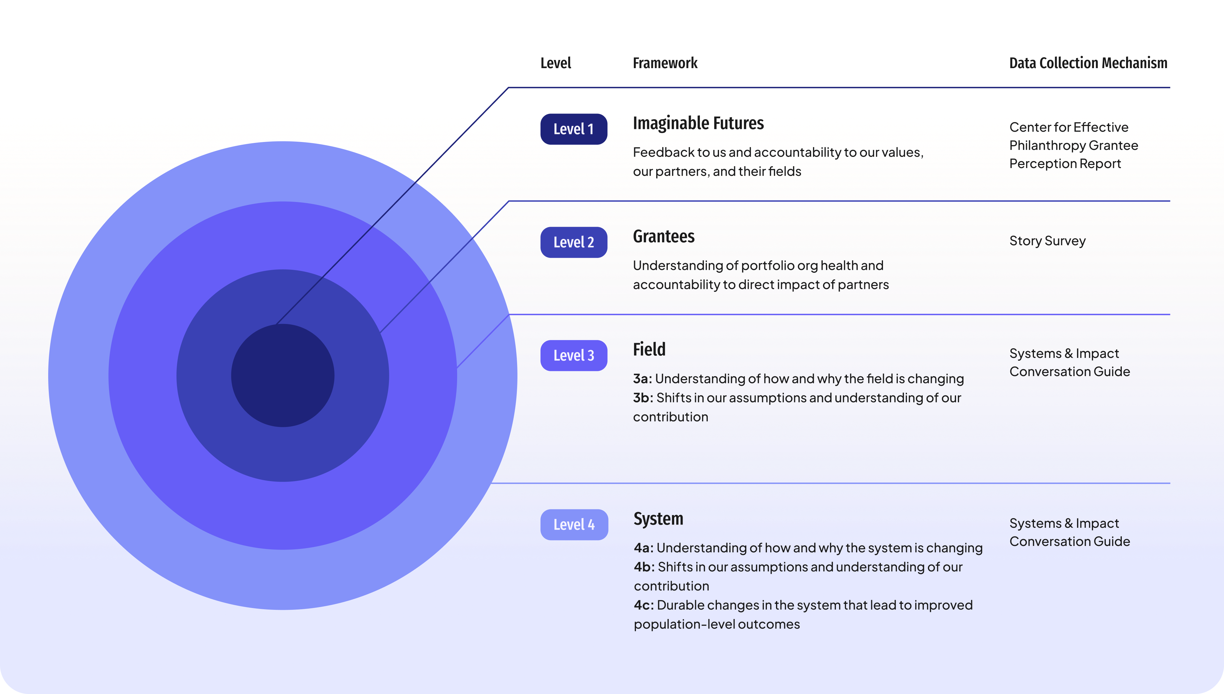 In 2025, we pulled back the curtain on how we’re experimenting with measuring impact amid changing systems. The framework tracks progress across three levels of accountability: (1) feedback to us and accountability to our values, partners, and fields; (2) partner contributions to their constituents and the field; and (3) field- and system-level change.